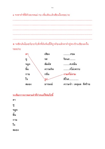 ๏ จงขีดเสนโยงอวัยวะกับส่งที่สัมพันธใหถูกตองแลวหาคําคูตรงขามเขียนลงใน
