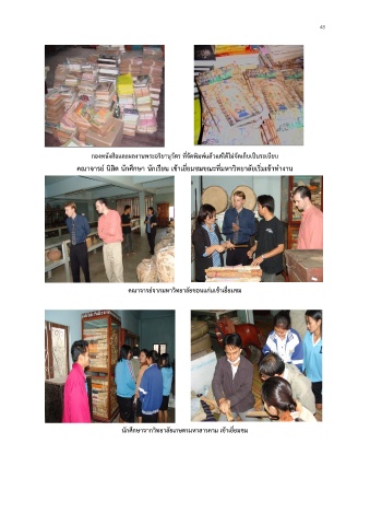 48 กองหนังสือและผลงานพระอริยานุวัตร ที่จัดพิมพ์แล้วแต่ได้ไม่จัดเก็บเป็นระเบียบ คณาจารย์ นิสิต นักศึกษา นักเรียน เข้าเยี่ยมชมขณะที่มหาวิทยาลัยเริ่มเข้าท างาน คณาจารย์จากมหาวิทยาลัยขอนแก่นเข้าเยี่ยมชม นักศึกษาจากวิทยาลัยเกษตรมหาสารคาม เข้าเยี่ยมชม