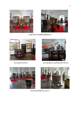 54 ส่วนห้องโถงกลางของพิพิธภัณฑ์คัมภีร์ใบลาน ตู้วางแสดงผลงานปริวรรต ตู้วางแสดงพัฒนาการของตัวอักษรที่จารในใบลาน หีบพระธรรมเก็บคัมภีร์ลวดลายต่างๆ