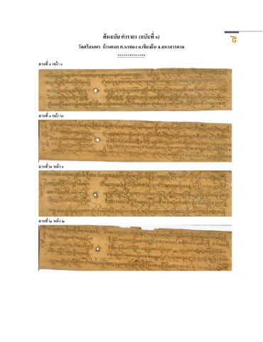 ตนฉบับ ต ำรำยำ (ฉบับที่ ๑) ๗ ้ วัดศรสมพร บำนแบก ต.นำทอง อ.เชยงยน จ.มหำสำรคำม ้ ี ื ี ************** ลำนที่ ๑ หนำ ๑ ้ ้ ลำนที่ ๑ หนำ ๒ ้ ลำนที่ ๒ หนำ ๑ ้ ลำนที่ ๒ หนำ ๒