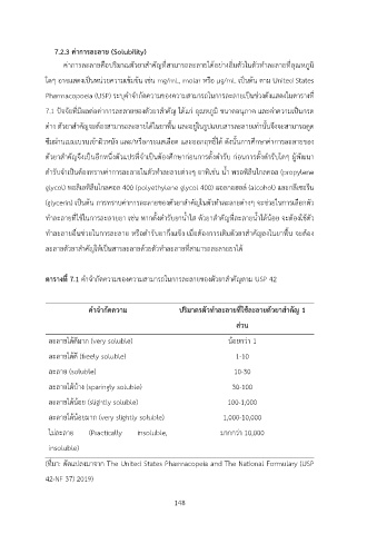 ตารางที่ 7.1 คำจำกัดความของความสามารถในการละลายของตัวยาสำคัญตาม USP 42