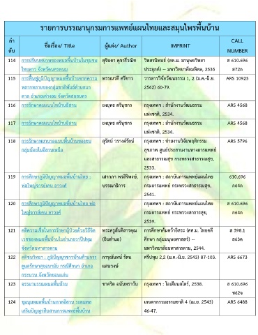 119 การศึกษาภูมิปัญญาหมอพื้นบ้านไทย : เสาวภา พรสิริพงษ์, กรุงเทพฯ : สถาบันการแพทย์แผนไทย 610.696