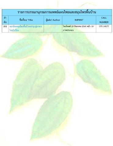รายการบรรณานุกรมการแพทย์แผนไทยและสมุนไพรพื้นบ้าน ล า ชื่อเรื่อง/ Title ผู้แต่ง/ Author IMPRINT CALL ดับ NUMBER 202 หมาน้อยสมุนไพรพื้นบ้านแปรรูปสู่อาหาร ไทยโพสต์ 29 สิงหาคม 2560 หน้า 18 CPS 14177 ในครัวเรือน ภาพประกอบ
