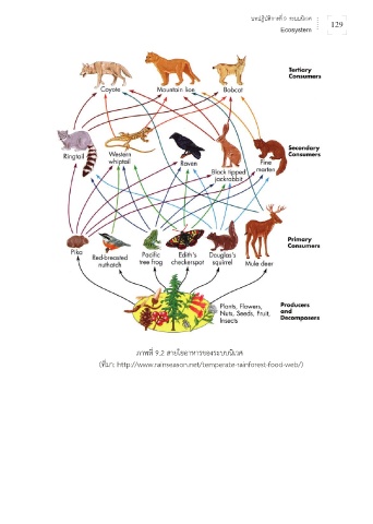 บทปฏบัติการท 9 ระบบนเวศ ี� ิ ิ Ecosystem 129 ป ฏิบั ติกา ร ชีว วิท ย า 1 | 113 ภาพที 9.2 สายใยอาหารของระบบนิเวศ ่ (ที่มา: http://www.rainseason.net/temperate-rainforest-food-web/) ปฏิบัติการที่ 9 ระบบนิเวศ (Ecosystem)