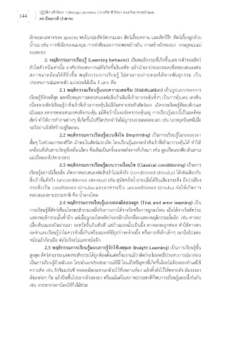 2. พฤตกรรมการเรียนรู้ (Learning behavior) เป็นพฤติกรรมที่เกิดขึ้นเฉพาะตัวของสัตว์